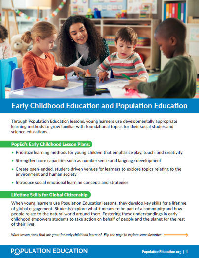 Through Population Education lessons, early childhood learners use developmentally appropriate learning methods to grow familiar with foundational topics for their social studies and science educations.