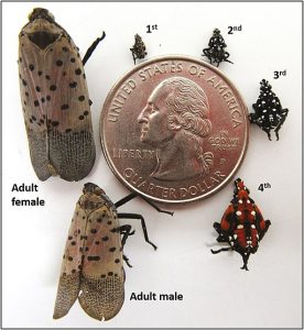 The Spotted Lanternfly (SLF) is a flying insect native to several countries in Asia – specifically, China, India, and Vietnam. The spotted lanternfly was first spotted in the U.S. in Berks County, Pennsylvania in 2014. It is believed that the SLF arrived as egg masses attached to stone on a shipment from China.